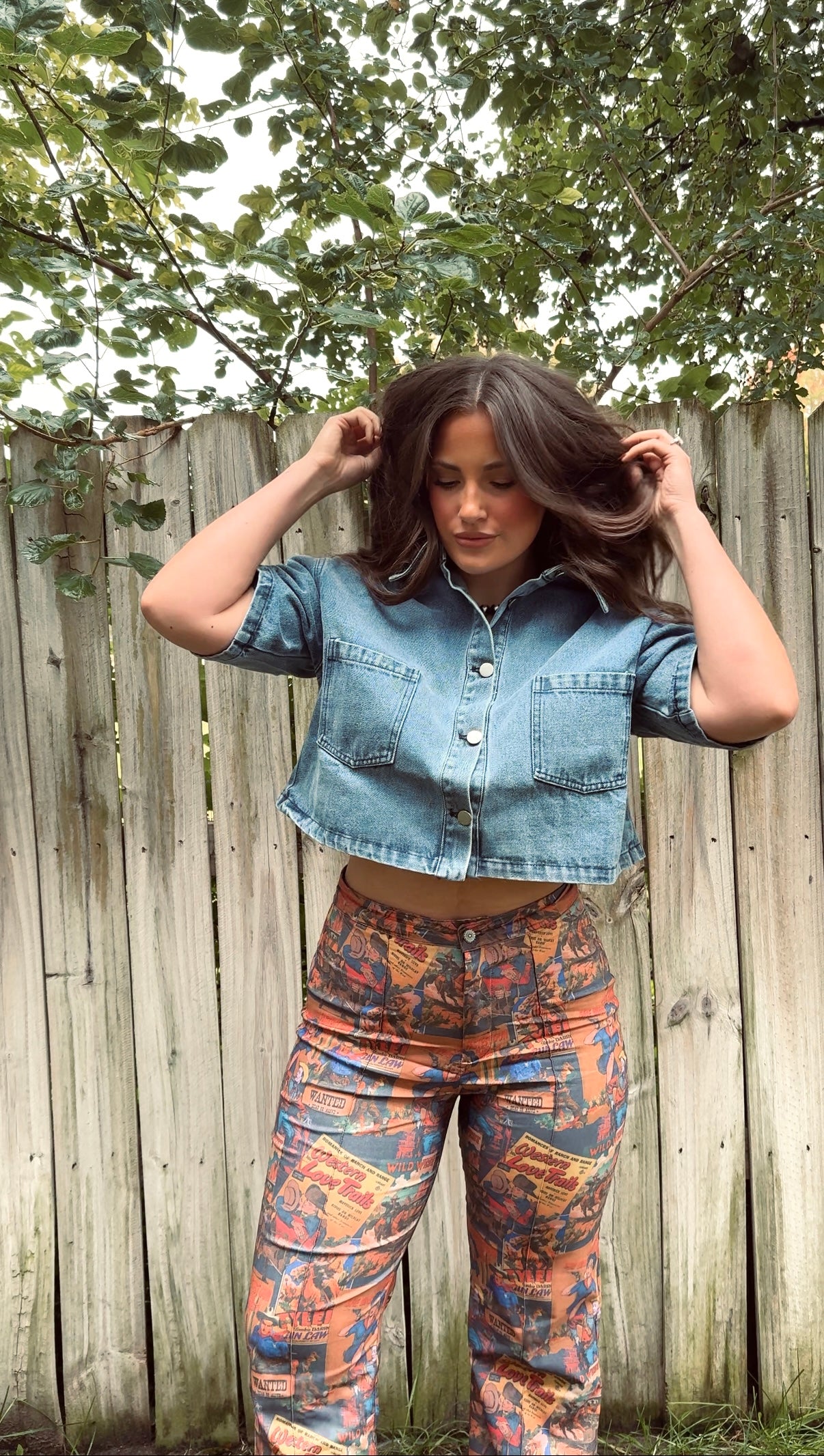 Step out in true Western style with these high-waisted flare pants, designed with rugged charm and a flattering fit. Perfect for rodeo nights or a day on the ranch.