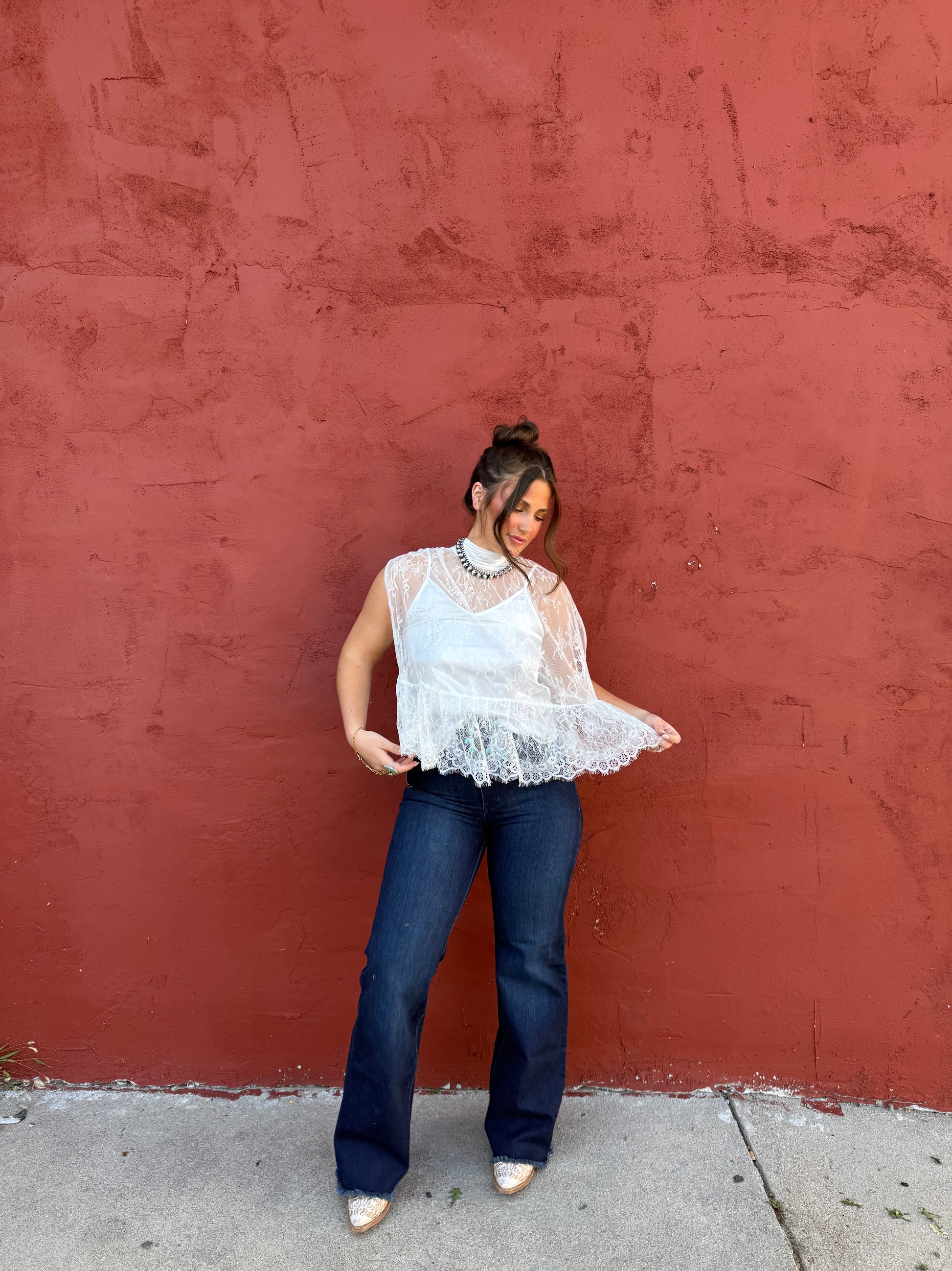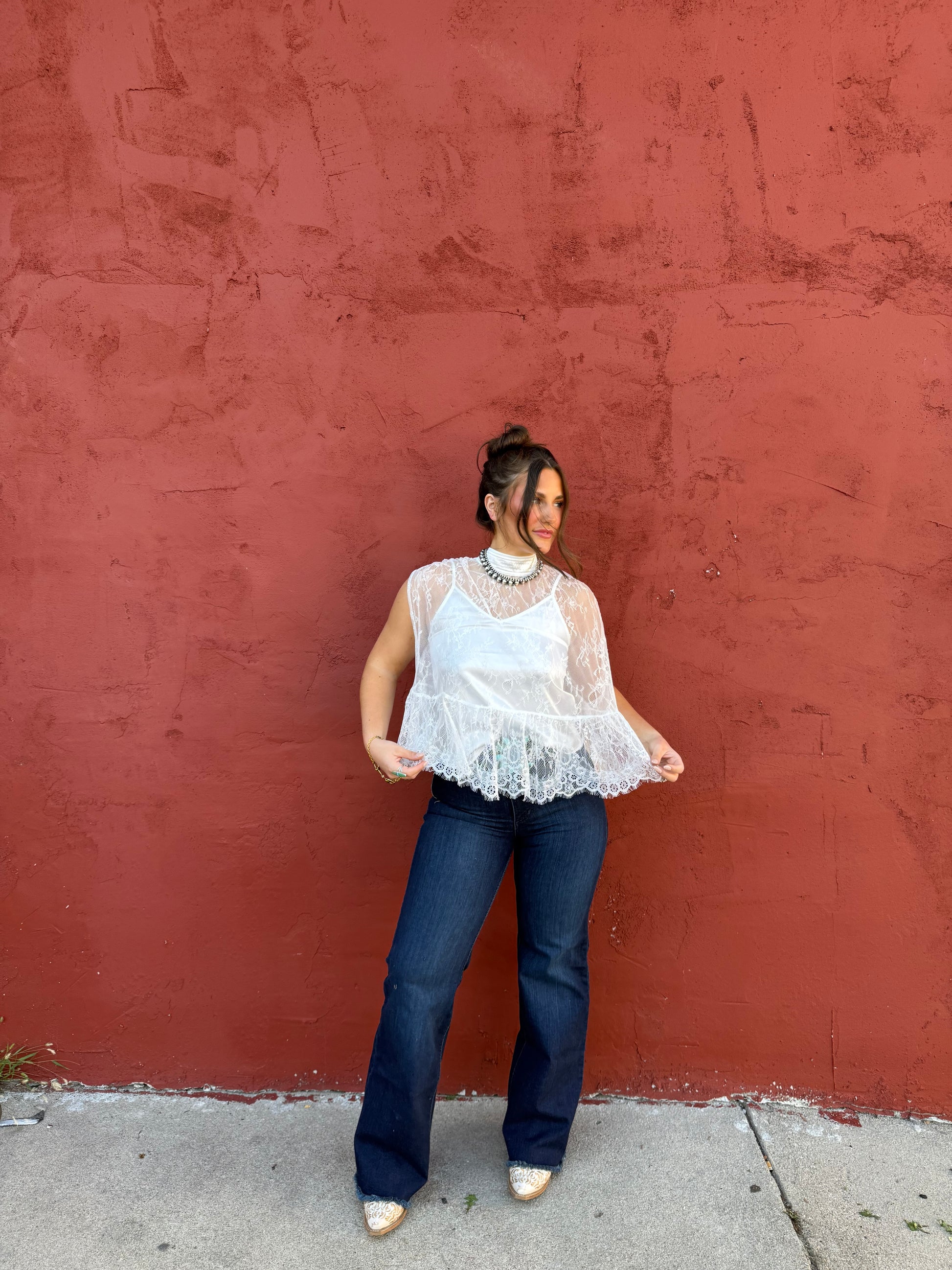 A dreamy blend of western grace and modern glamour. This white lace cape drapes effortlessly over a silky satin undershirt, creating a look that’s soft, striking, and unmistakably cowgirl chic. Perfect for turning heads from the arena to the afterparty.