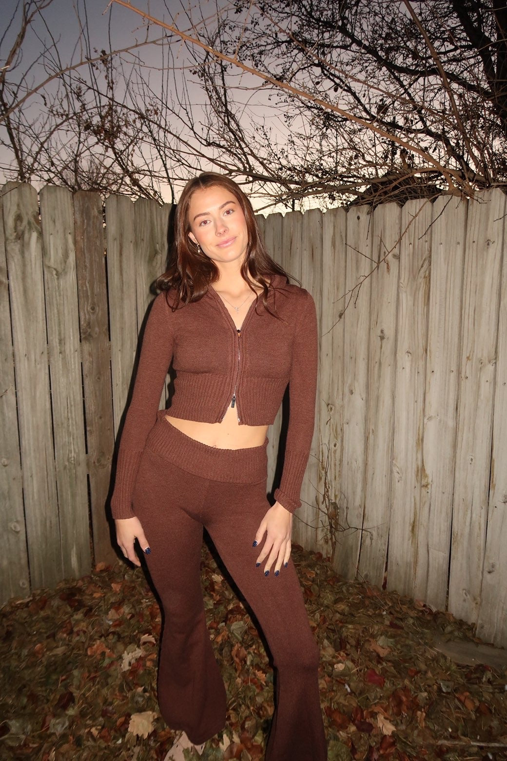 Elevate your loungewear with this rich chocolate brown set. Crafted from soft sweater-knit material, it features a zip-up top for effortless layering and fold-over flare pants for a relaxed yet stylish silhouette. Perfect for cozy days at home or casual outings with a touch of chic comfort.